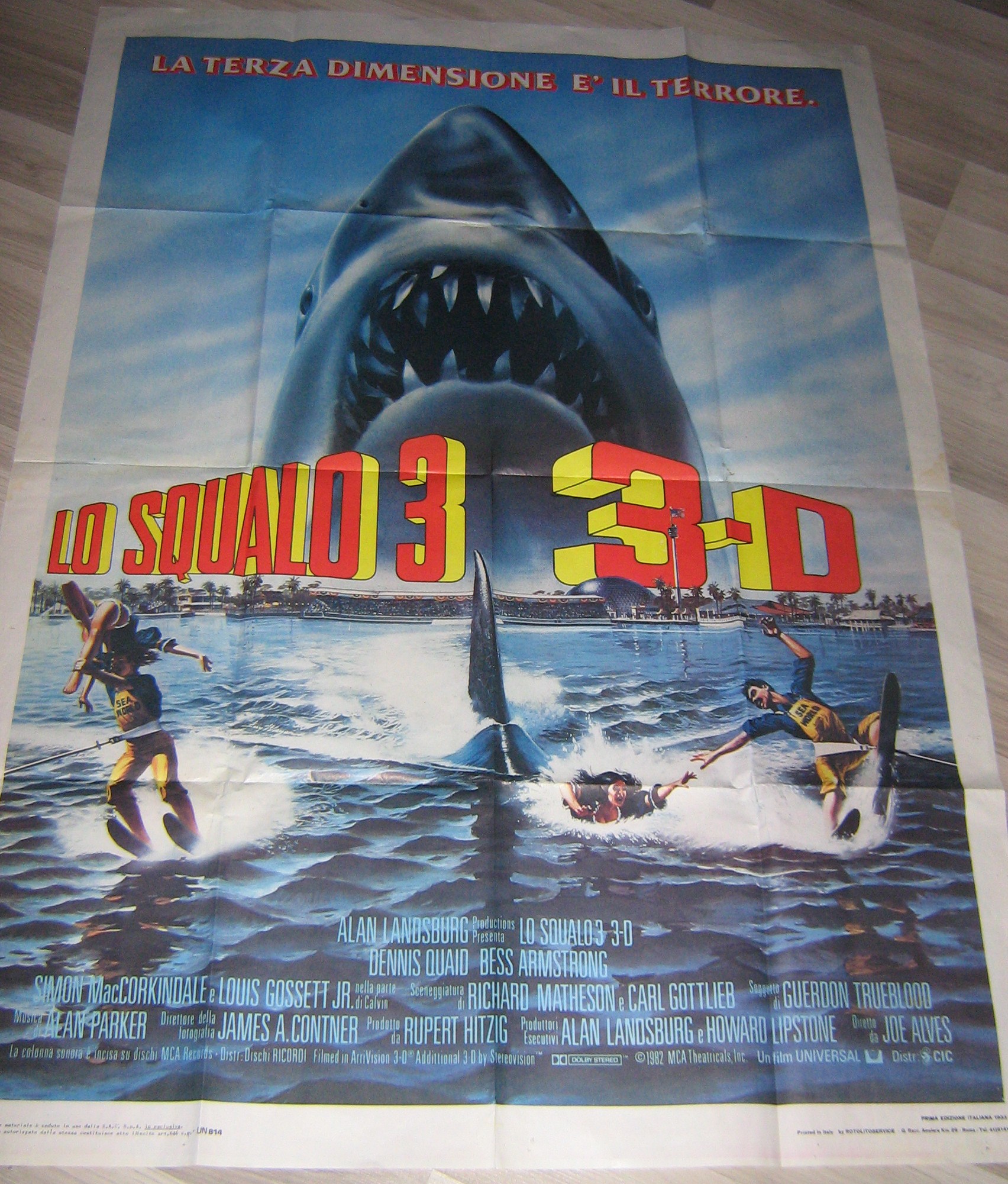 Vous vous souvenez certainement de cet article rédigé il y a près d’ un an et demi à propos des deux locandina de Lo Squalo 3 (si ce n’est pas le cas, cliquez ici). Un article qui, étrangement, n’ aura pas suscité beaucoup d’ intérêt au sein de la communauté Jaws 3D. Nul doute que cette affiche géante  saura sortir le visiteur de sa torpeur! Comme le titre l’ indique, cet exemplaire est consacré à la copie 3D du film de Joe Alves. Ses dimensions de rêve (100×140 soit 39×55 pouces) font de cet objet une pièce de collection particulièrement recherchée. En témoigne sa rareté et son prix… Idéal donc pour tout ceux qui souhaitent décorer les murs de leur salon dans le but d’ impressionner leurs voisins. Quoi qu’ il en soit, mon anniversaire approche à grands pas et j’ espère que dans la tonne de cadeaux que vous me ferez parvenir, j’ y trouverai l’ affiche de la version plate. Je compte avant tout sur la générosité de mes lecteurs italiens…